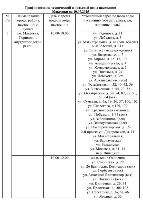 Завтра, 10 июля, в Макеевке будет организован подвоз воды для жителей, в дома которых из-за недостаточного количества подаваемой воды не поступила вода в установленный графиком день.