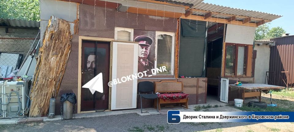 В одном из дворов Кировского района Донецка корреспондентом «Блокнот Донецк» обнаружена уникальная зона отдыха: жильцы построили что-то вроде беседки с огромными портретами Иосифа Сталина и Феликса Дзержинского.