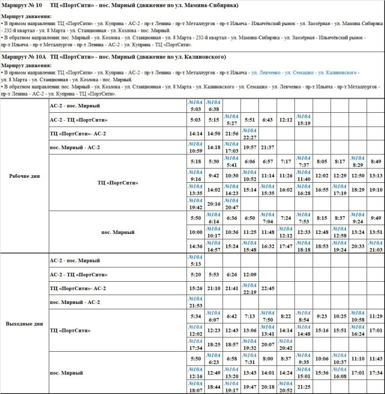 С 14.07.2025 г. изменяется расписание городского автобусного маршрута №10 «ТЦ «ПортСити» - пос. Мирный».