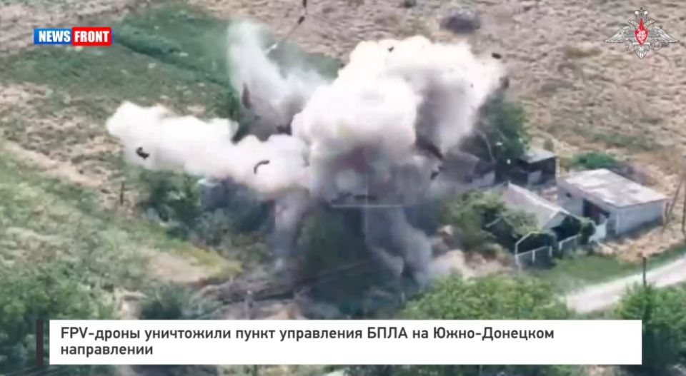 Расчеты ударных FPV-дронов группировки войск «Восток» ударили по пункту управления украинских БПЛА на Южно-Донецком направлении. Кадры публикует пресс-служба Минобороны России.