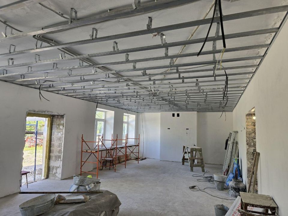 Строители региона-шефа собирают каркас навесного потолка и конструкции входной группы, продолжаются работы по монтажу электропроводки.