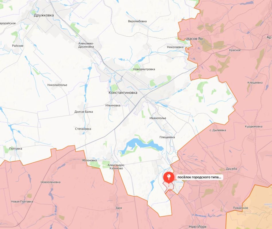 Константиновском направлении ВС России продемонстрировали флаг в н.п. Петровка, однако, бои продолжаются. Приближается к завершению тяжёлый штурм Яблоновки. Завершение этих наступательных действий с нескольких сторон вскоре может означать выход ВС России к Клебан-Быкскому водохранилищу, строго в 3 км на север от которого находится Константиновка. С северо-востока наши продолжают бои севернее посёлка Дылеевка и западнее одноимённого села Дылеевка.