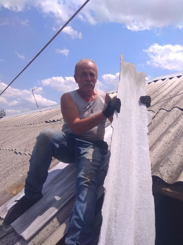 Сотрудники МУП АГОД «Управляющая компания Петровского района» проводят работы по ремонту шиферной кровли жилого дома, расположенного по адресу: ул. Ревякина, д. 34.