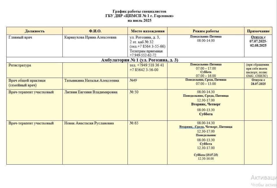 График работы специалистов ГБУ ДНР "ЦПМСП № 1 г. Горловки", ГБУ ДНР "ЦПМСП № 2 г. Горловки" и ГБУ ДНР "Городская стоматологическая поликлиника г. Горловки"