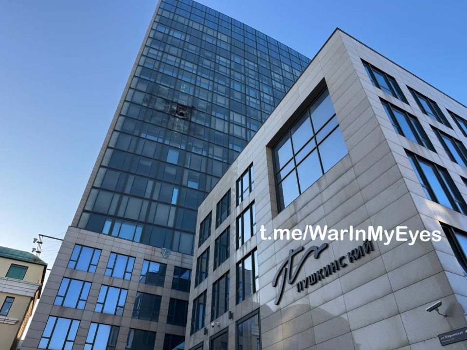 Последствия прилета ударного дрона самолетного типа по БЦ «Пушкинский» в Ворошиловском районе Донецка