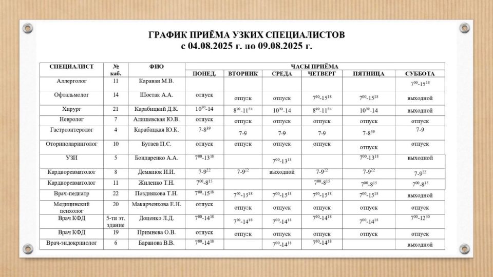 Графики приема специалистов ГБУ ДНР «ГСП г.Горловки», ГБУ ДНР «ЦОМД г.Горловки», ГБУ ДНР «ГДВД г.Горловки», ГБУ ДНР «ГДСП г. Горловки», «Городской наркологический диспансер г. Горловки МЗ ДНР»