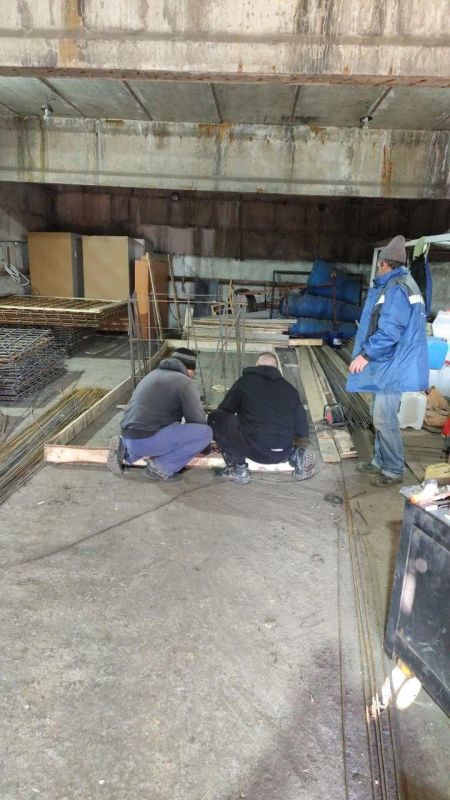Рабочая бригада из региона-шефа обустраивает арматурные каркасы для придания устойчивости монолитному фундаменту в здании.