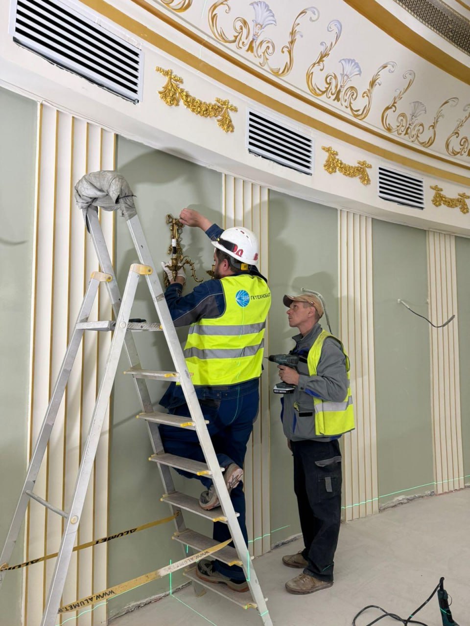 На объекте выполняются масштабные отделочные работы на всех этажах, монтируется вентиляция, лифты и сложное сценическое оборудование.