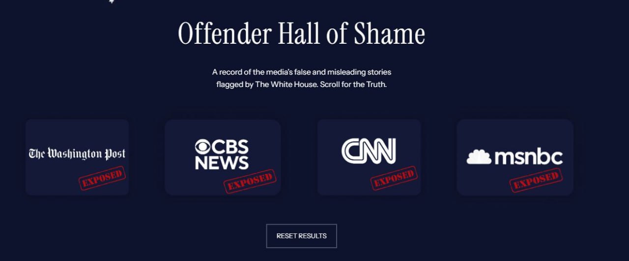 На сайте Белого дома появился список СМИ, которые, по версии администрации Трампа, «вводят в заблуждение». Например, Boston Globe, CBS News и The Independent обвиняются в том, что неверно подавали слова Трампа. В раздел «Зал позора» попали The Washington Post, CBS News, CNN, а в расширенном списке оказались Associated Press, The New York Times, The Wall Street Journal, Politico и Axios.