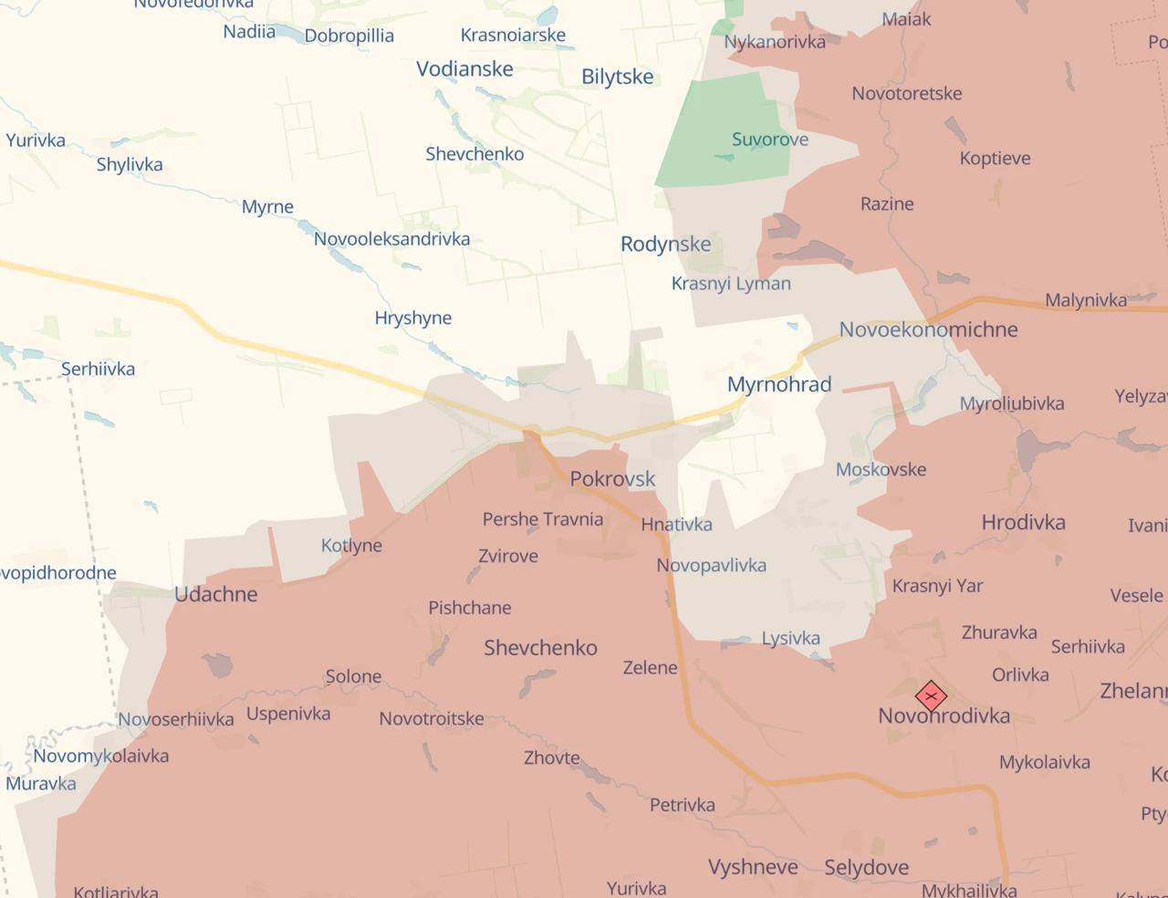 В Мирнограде российские войска заняли юго-восточную часть города до улицы Сретенской и одновременно вклинились в северные кварталы, продвигаясь от Новоэкономического. ВС России вышли к Т-образному перекрестку южнее Родинского и пытаются закрепиться там.
