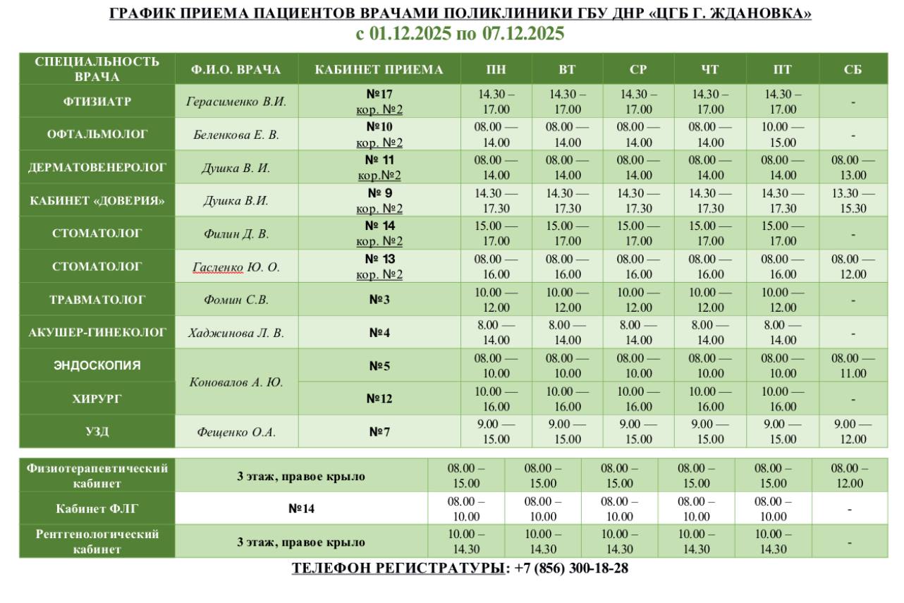 Актуальный график приема специалистами ГБУ ДНР «ЦГБ г. Ждановка» с 01.12.2025 по 07.12.2025