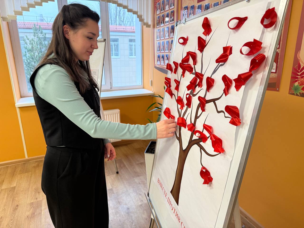 Наши активисты раздавали учащимся международный символ осознания людьми важности проблемы СПИДа — красные ленточки. Прикрепив такую ленточку к дереву, каждый выразил свою солидарность с теми, кого затронула эта проблема, и поддержал идею здорового и безопасного образа жизни. Помимо символичного атрибута, все участники акции получили специальные памятки.
