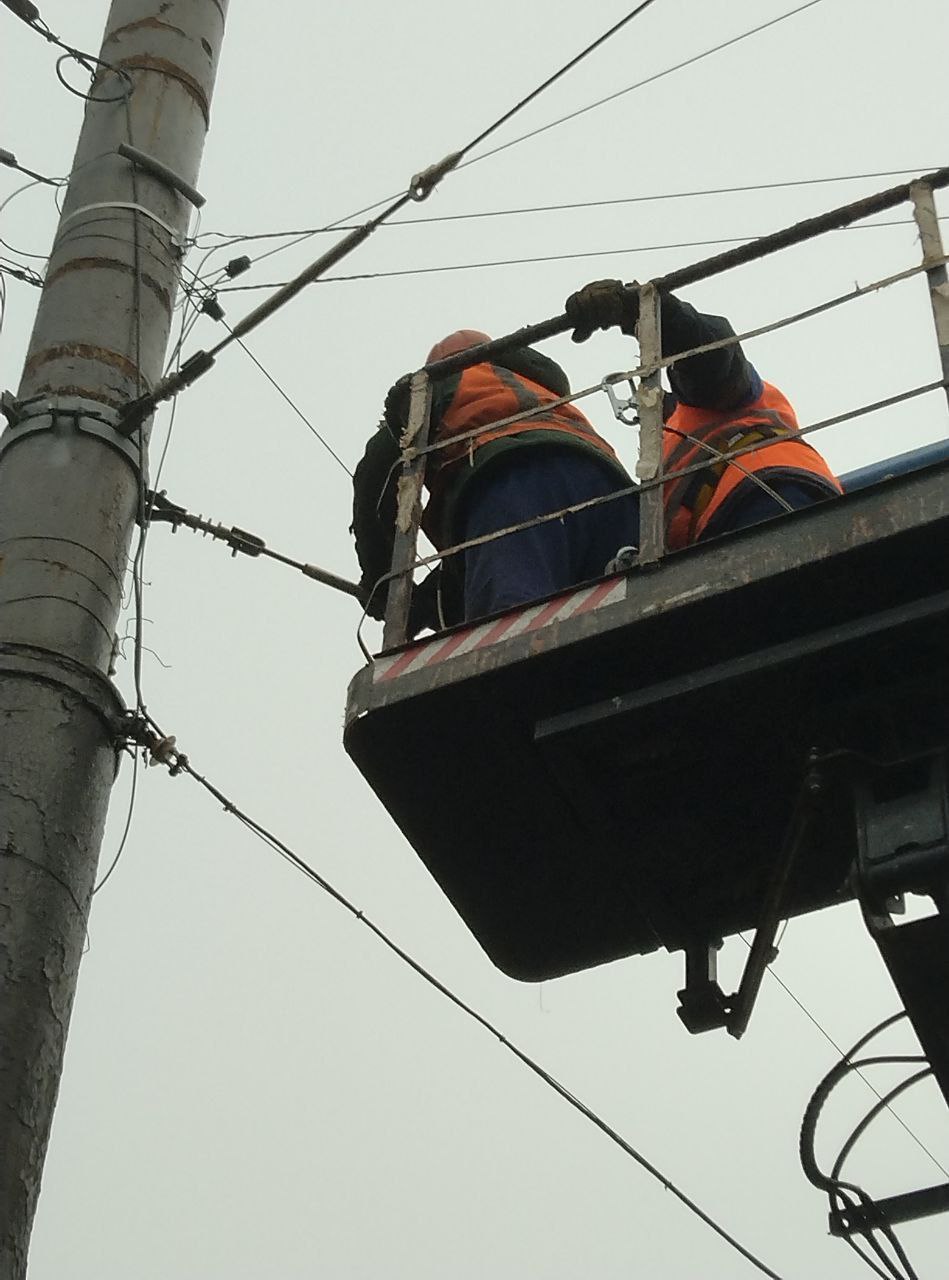 Специалистами службы энергохозяйства МУП "МАРИУПОЛЬТРАНС" выполнены работы по регулировке специальных держателей контактного провода на радиусных участках контактной сети