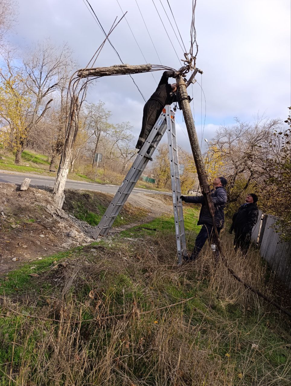 На территории городского округа Торез продолжаются работы по замене аварийных опор линий наружного освещения и переподключения проводов.