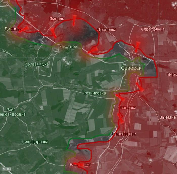 «На Северском направлении российские войска после захвата Звановки форсировали Бахмутку и штурмуют Свято-Покровское с юго-востока, пытаясь закрепиться в центре населенного пункта. Если им это удастся, то последняя асфальтированная трасса снабжения в Северск будет перерезана»