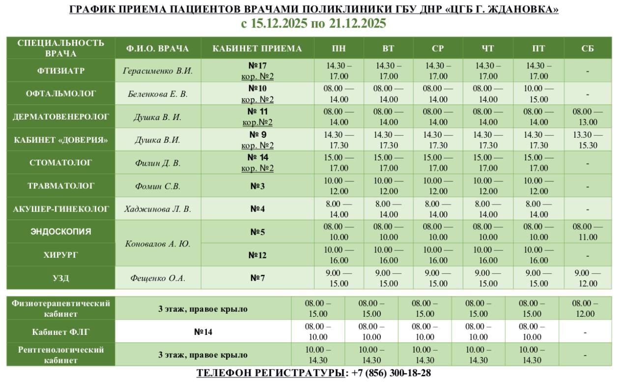 Актуальный график приема специалистами ГБУ ДНР «ЦГБ г. Ждановка» с 15.12.2025 по 21.12.2025