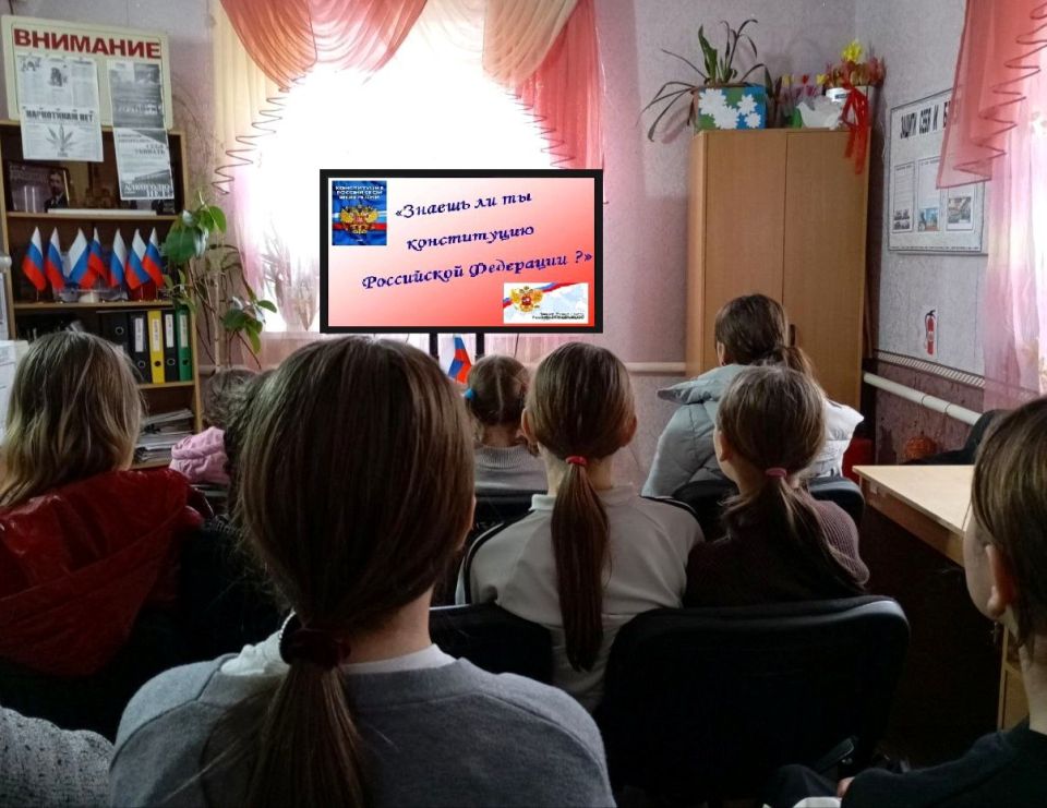 Ребята ознакомились с историей возникновения государственности и принятия Конституции Российской Федерации, основными правами и обязанностями граждан, гарантированными этим документом. Ведущая рассказала школьникам о том, как менялась жизнь нашего общества и какие события приводили к необходимости принятия новых конституционных актов, почему так необходимо знать содержание Конституции, как ее статьи помогают людям защитить свои права.