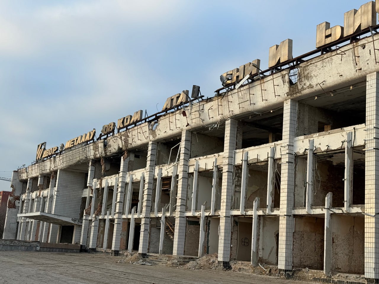 Строители из Санкт-Петербурга ведут подготовительные работы по восстановлению ДК «Металлургов» в Мариуполе. Здание, сильно пострадавшее в 2022 году, ожидает полное обновление.