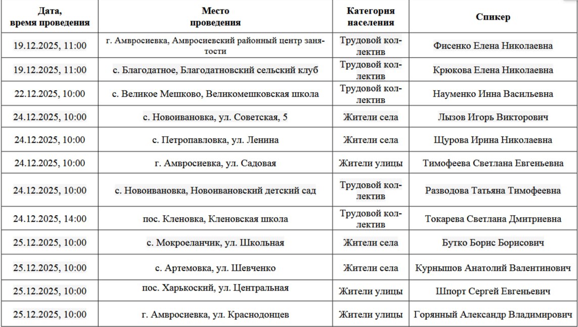 График проведения встреч с населением на подведомственных территориях руководящим составом администрации Амвросиевского муниципального округа, начальниками территориальных отделов администрации округа с 19 по 25 декабря