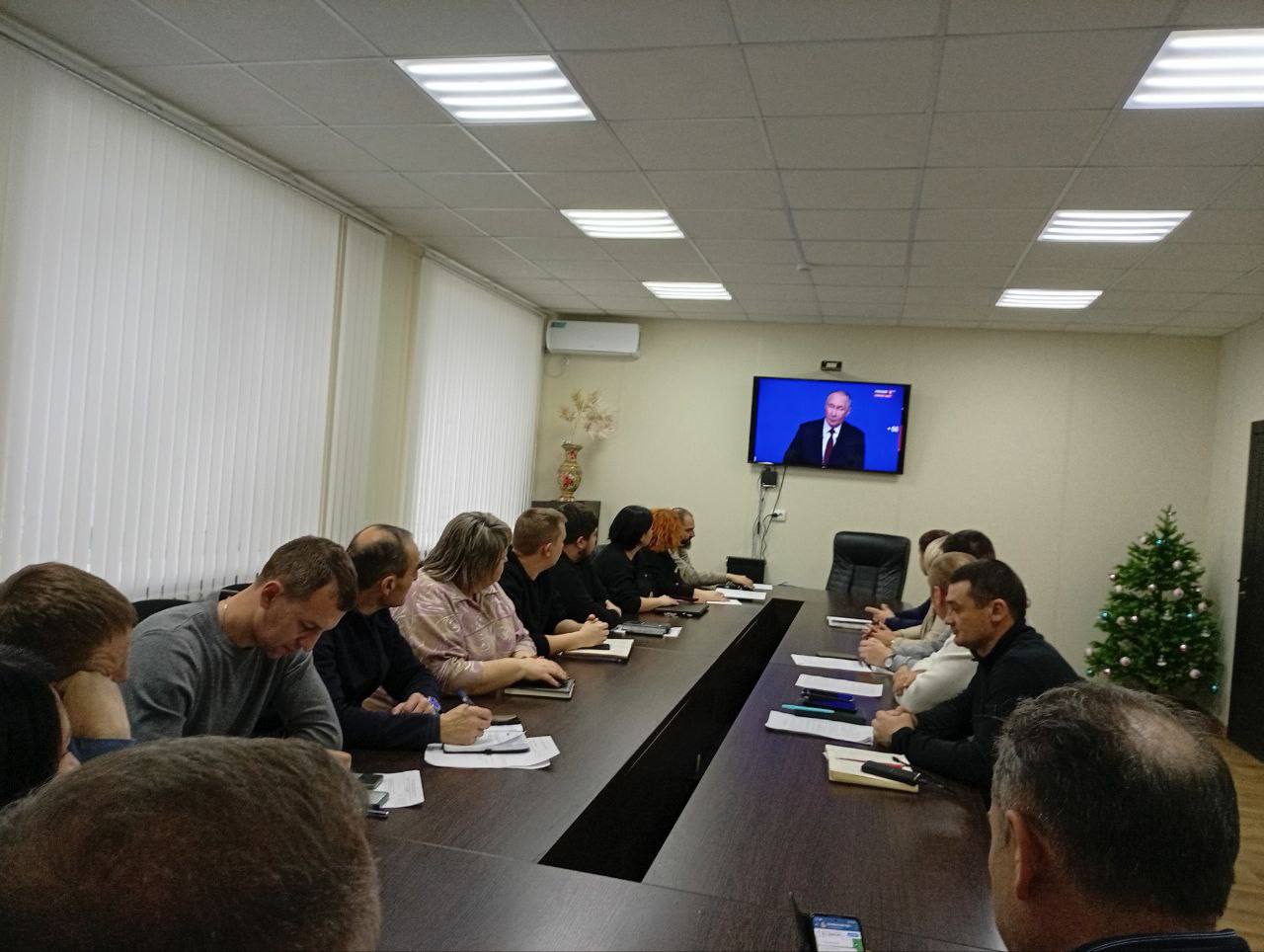 Председатель Волновахского муниципального совета, депутат от фракции «Единая Россия» Таймураз Арсоев, заместитель главы администрации Волновахского МО, координатор Женского движения"Единой России" Елена Снисаренко, руководители структурных подразделений администрации Волновахского МО приняли участие в программе «Итоги года с Владимиром Путиным»