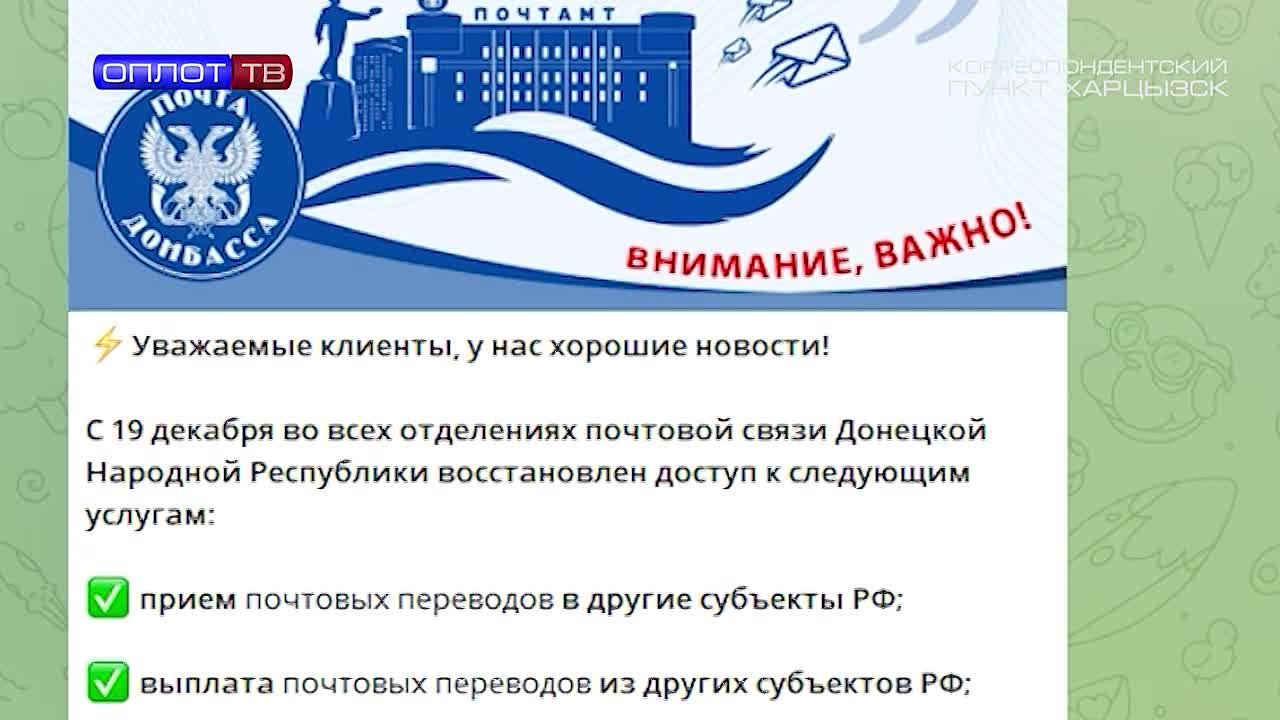 В Телеграм-канале «Почты Донбасса» уточняется: «С 19 декабря во всех отделениях почтовой связи Донецкой Народной Республики восстановлен доступ к следующим услугам: прием почтовых переводов в другие субъекты РФ, выплата почтовых переводов из других субъектов РФ и прием и выдача почтовых отправлений с наложенным платежом в другие субъекты РФ»