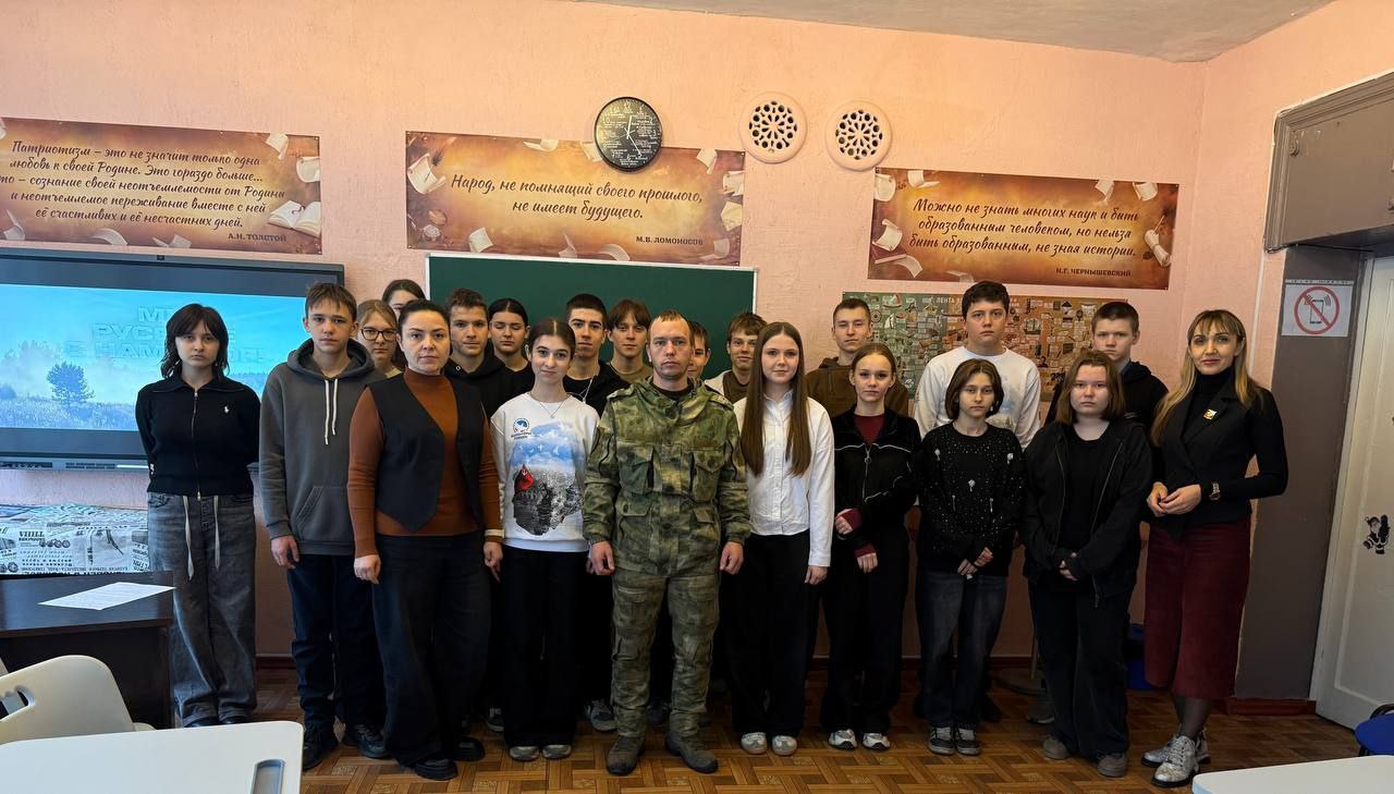 Для обучающихся 8-9 классов был проведён Урок Мужества, где почётным гостем стал участник боевых действий в зоне специальной военной операции, старший лейтенант Королович Юрий Ильич.