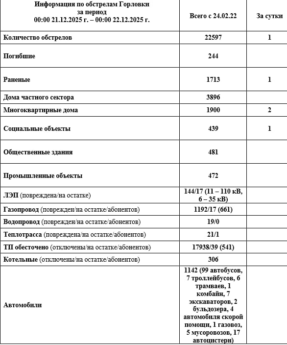 Информация по обстрелам Горловки с 00:00 21.12.2025 г. по 00:00 22.12.2025 г.