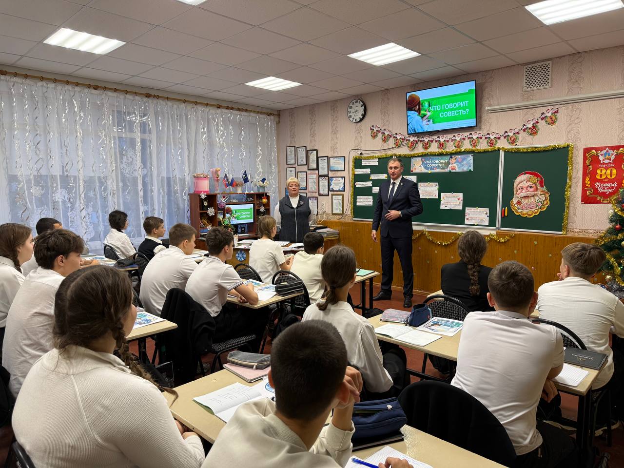Александр Васильевич рассказал обучающимся о сути совести, о важности жить по её голосу и совершать достойные поступки в повседневной жизни. В ходе беседы были разобраны примеры морального выбора и значимость личной ответственности перед семьёй, школой и обществом.