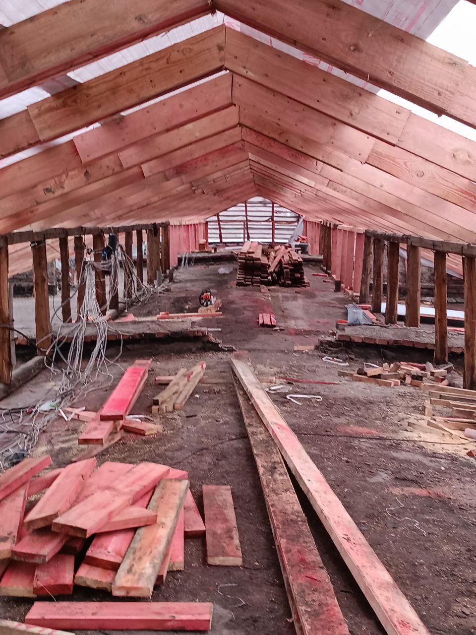 В настоящее время завершены работы по монтажу стропильной системы, деревянные элементы которой были обработаны огнезащитным составом. Также уложена обрешетка и установлена гидроизоляционная паропроницаемая антиконденсатная пленка, предотвращающая проникновение влаги в конструкцию.