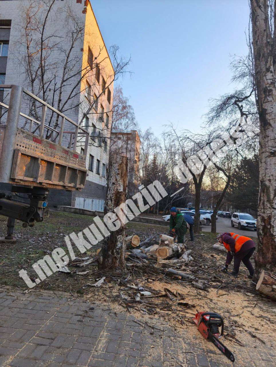 Сегодня специалисты занималась уборкой и вывозом опавшей листвы и веток, а также произвели валку и распил сухих деревьев.