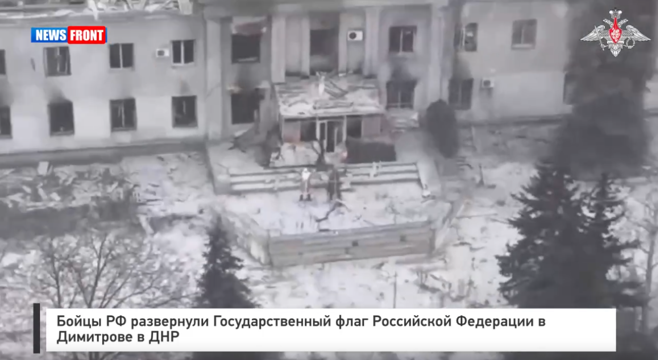 Минобороны России опубликовало видео, на котором запечатлено, как российские военнослужащие разворачивают флаг страны в городе Димитров в ДНР.