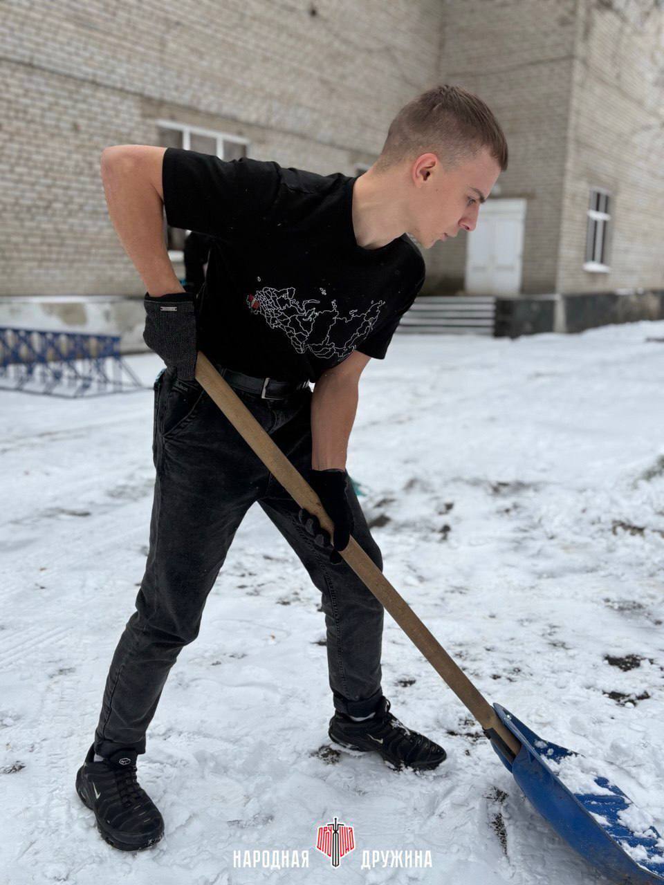 Дружинники вооружились лопатами, чтобы обеспечить безопасный и удобный проход для всех посетителей и спортсменов.
