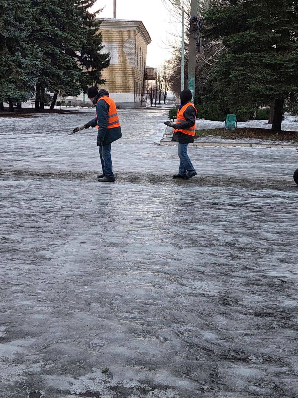 Для обеспечения безопасности пешеходов коммунальные службы города продолжают работу по обработке тротуаров противогололедной смесью.
