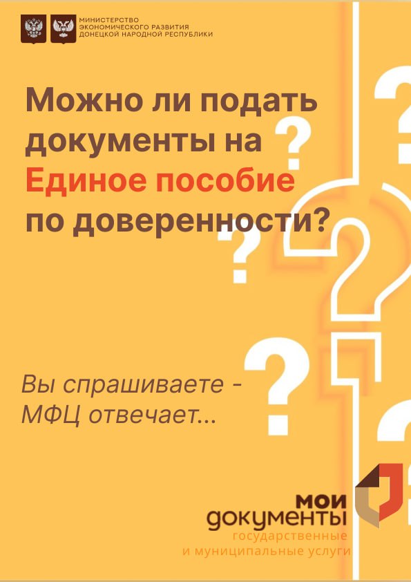 Да, данную услугу можно получить в любом отделении МФЦ ДНР.Подать документы на Единое пособие может Ваш представитель по нотариальной доверенности.