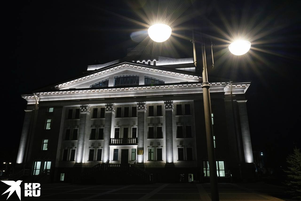 Огни ночного драмтеатра Мариуполя. Жители и гости города продолжают массово приходить на Театральную площадь в вечернее время и любоваться флагманом восстановления города.