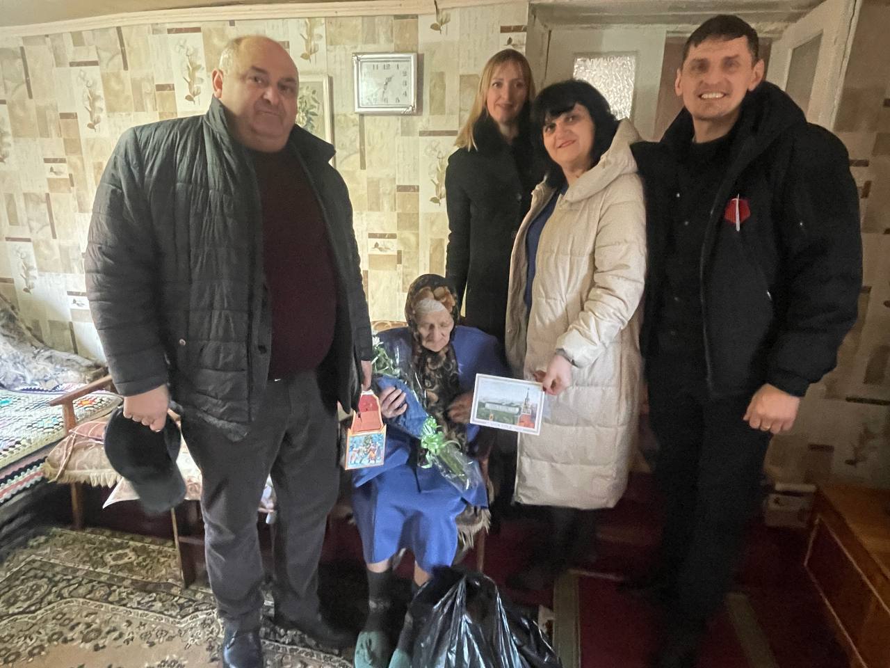 Ей были вручены поздравительная открытка от Президента Российской Федерации Владимира Путина, цветы и подарки. От имени секретаря партии, главы Мангушского округа Бориса Тримы гости пожелали виновнице торжества крепкого здоровья, мира и благополучия, поблагодарили за долголетний труд на благо родного округа.