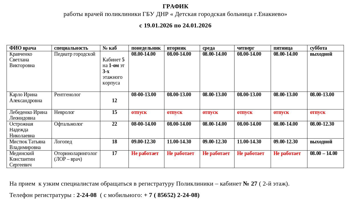 График работы врачей поликлиники детской городской больницы г. Енакиево с 19.01.2026 по 24.01.2026