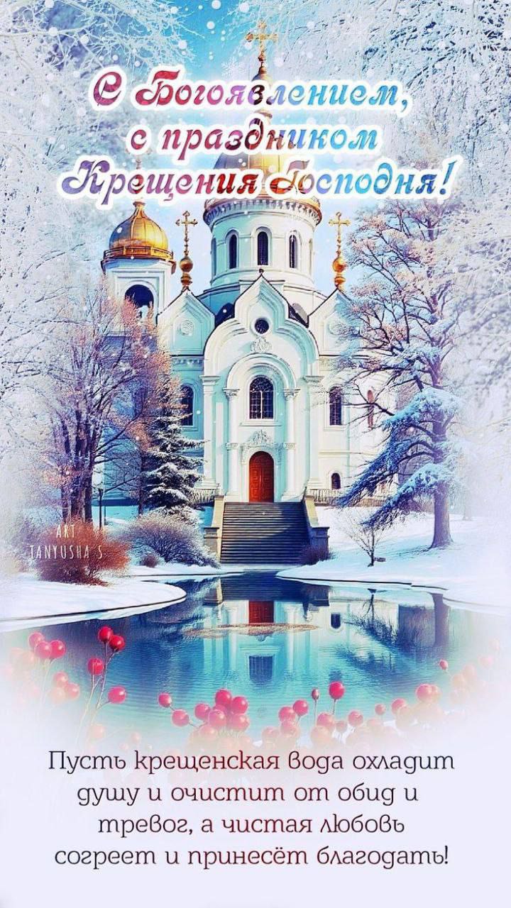 Поздравляю с Крещением Господним! Пусть этот светлый праздник наполнит жизнь благодатью, укрепит силы и подарит тихую радость. Мира вам и вашим близким!
