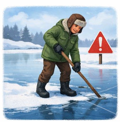 Попав случайно на тонкий лед, отходите назад скользящими осторожными шагами, не отрывая ног ото льда.