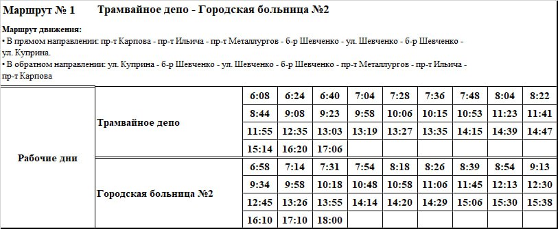 С 20.01.2026 г. актуальное расписание трамвайного маршрута №1 «Трамвайное депо - Городская больница №2».