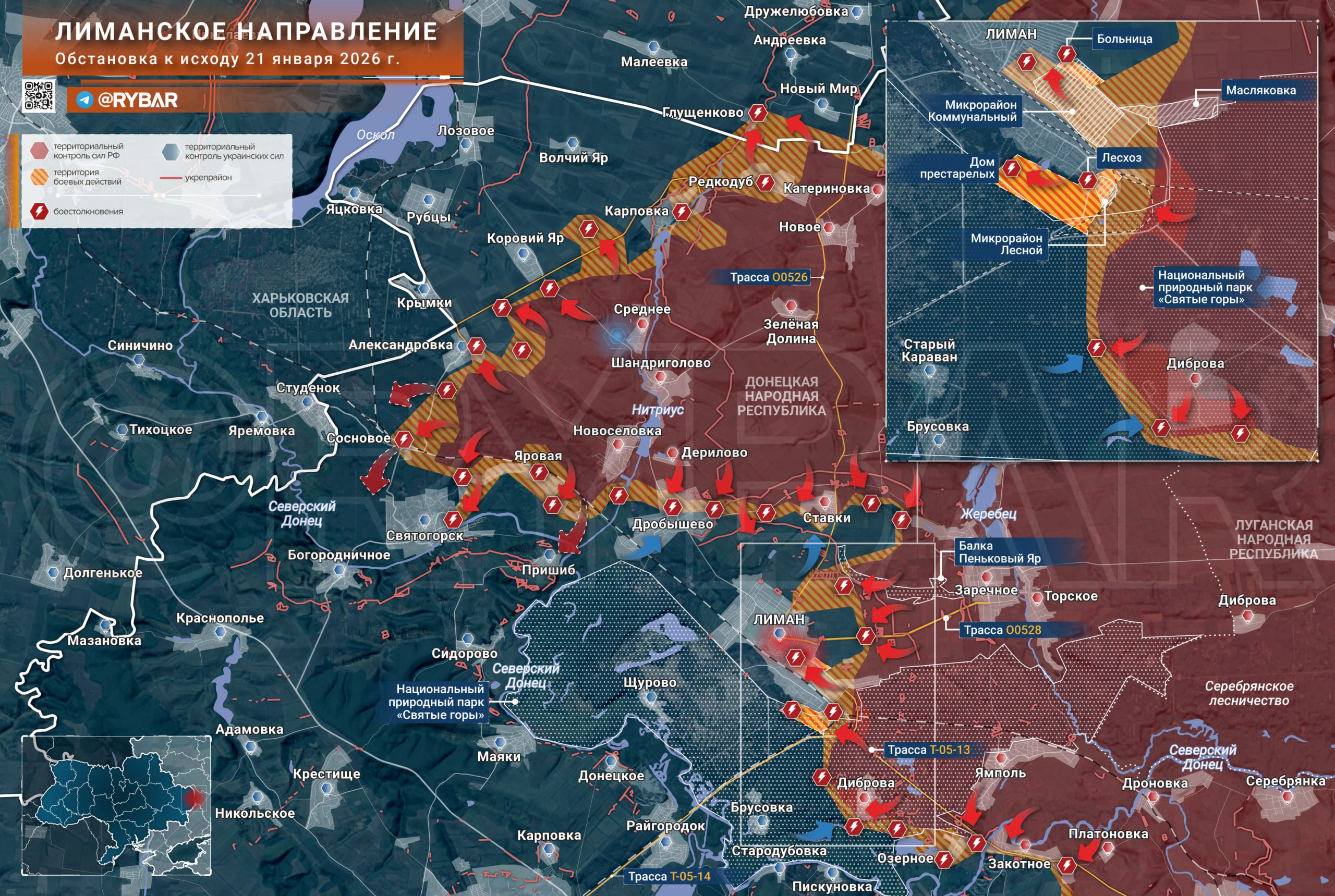 В самом Лимане штурмовики ведут бои в окрестностях городской больницы и на опорных пунктах на трассе Лиман — Заречное. На южной и юго-западной окраинах города российским войскам, по предварительным данным, удалось зацепиться за территорию лесхоза в микрорайоне Лесной и дома престарелых. Атаки здесь направлены на обход позиций ВСУ в застройке через густой лесной массив.