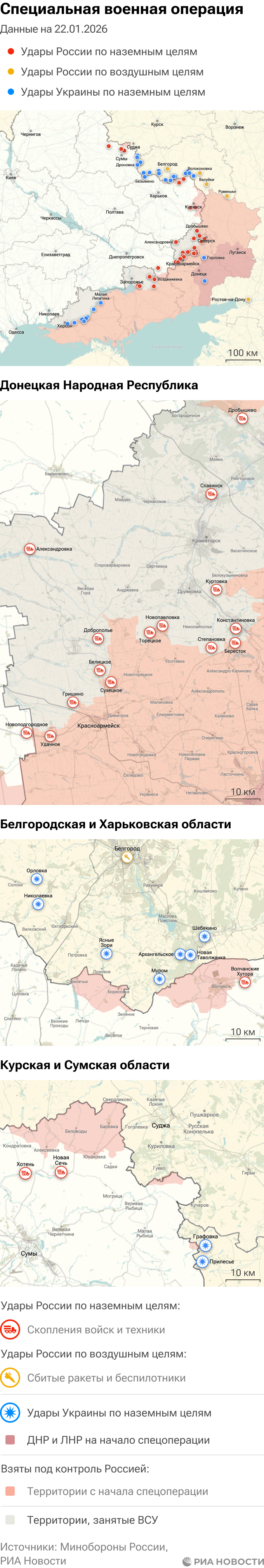 Российская армия с 24 февраля 2022 года проводит на Украине специальную военную операцию. Ее главной целью является помощь Донецкой и Луганской народным республикам, на территории которых с 2014 года не прекращались обстрелы. Перед российскими военными поставлена задача минимизировать потери личного состава и мирного населения при выполнении боевых заданий.Данные Минобороны и администраций новых регионов на 22 января 2026 года