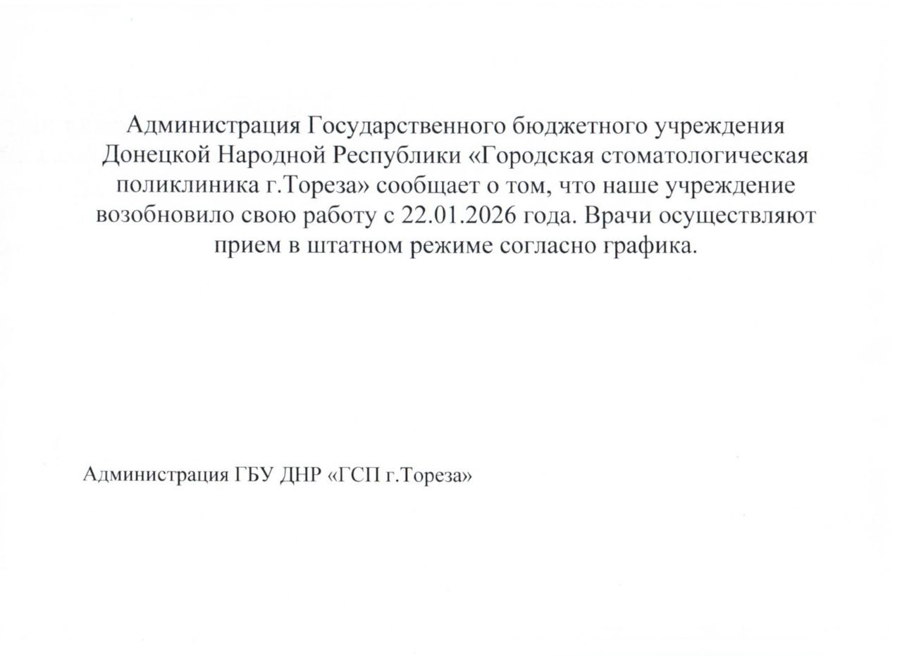 Администрация городского округа Торез информирует о графике приема пациентов врачами ГБУ ДНР "Городская стоматологическая поликлиника г. Тореза" с 22.01.2026