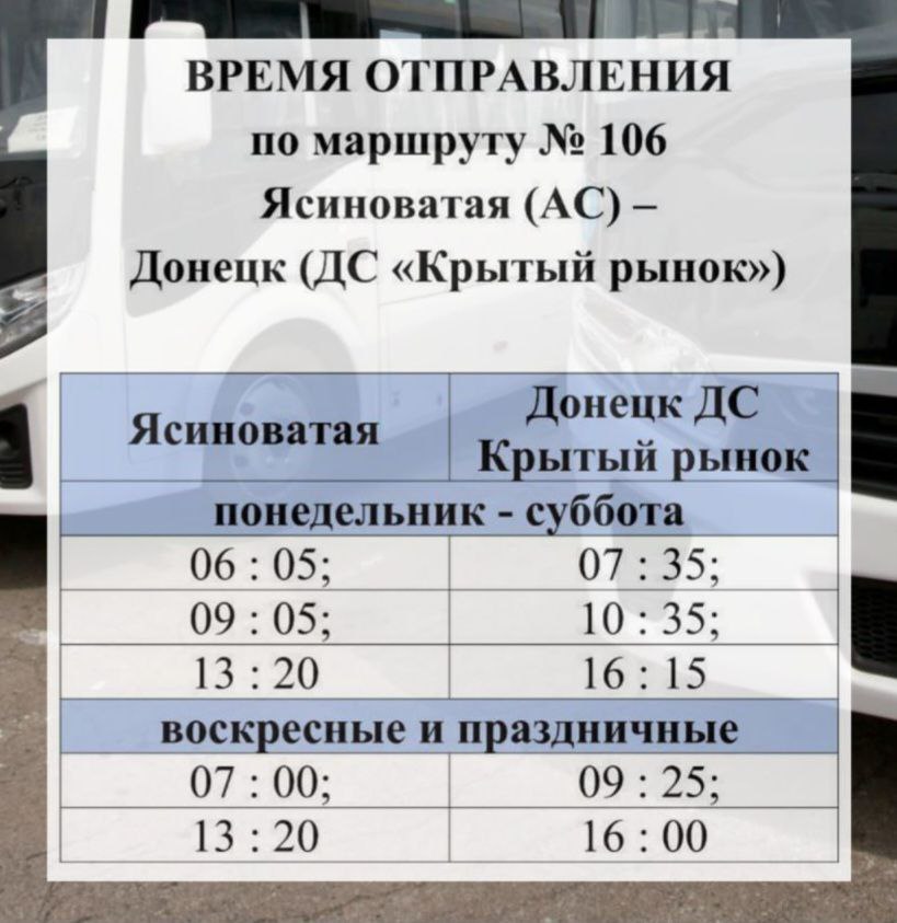 Сохраняйте график работы маршрута № 106 «Ясиноватая (АС) – Донецк (ДС «Крытый рынок»)» и делитесь с близкими. Автобус будет курсировать 3 раза в день в будние дни и 2 раза в день в выходные.