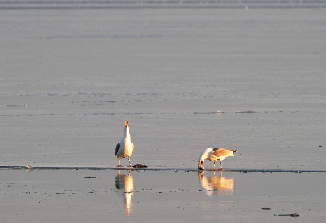 Два кадра из жизни азовских чаек. На фотографиях — хохотунья, вид птиц из семейства чайковых. Одна (справа) поедает только что пойманную рыбку, а вторая как раз «смеется» над первой, издавая привычный жителям Мариуполя радостный морской крик.