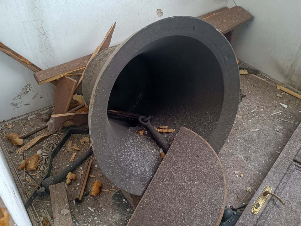 Из храма вынесено четыре подсвечника, лампады, латунный алтарный аналой и выпотрошены ящики для пожертвований. С колокольни украдено 8 из 10 колоколов.