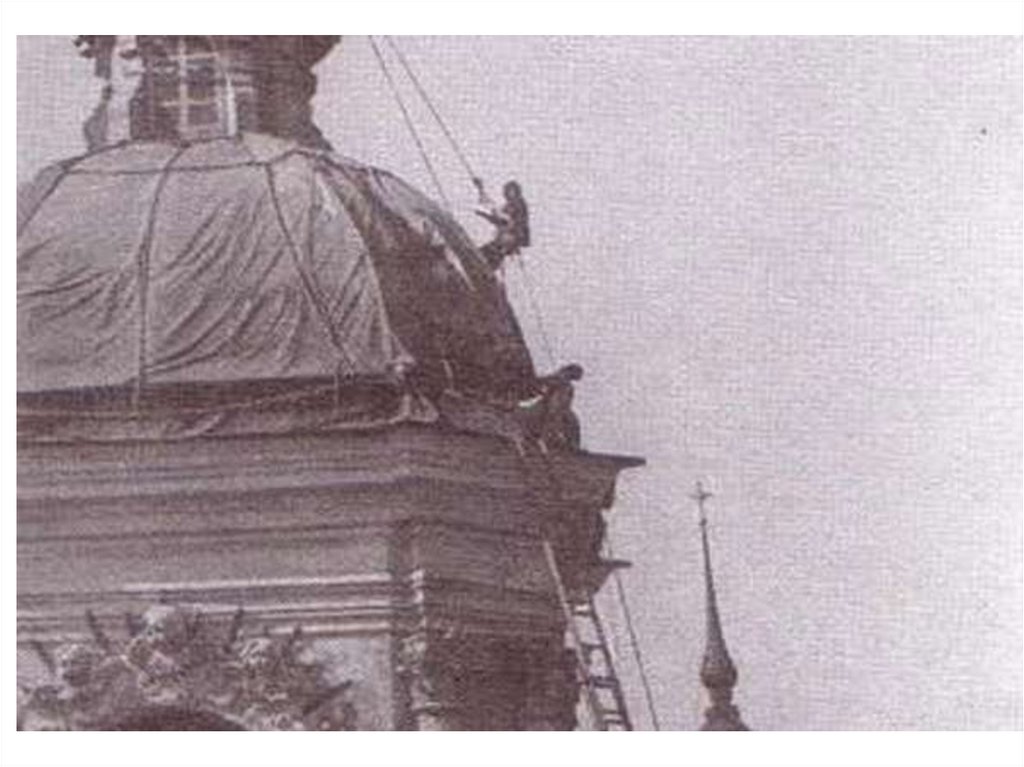 Первым для маскировки выбрали Исаакиевский собор. На «Исаакий» альпинистам забраться было несложно, и уже через десять дней окрашенные в серый купол и звонницы собора «растворились» в небе Ленинграда.