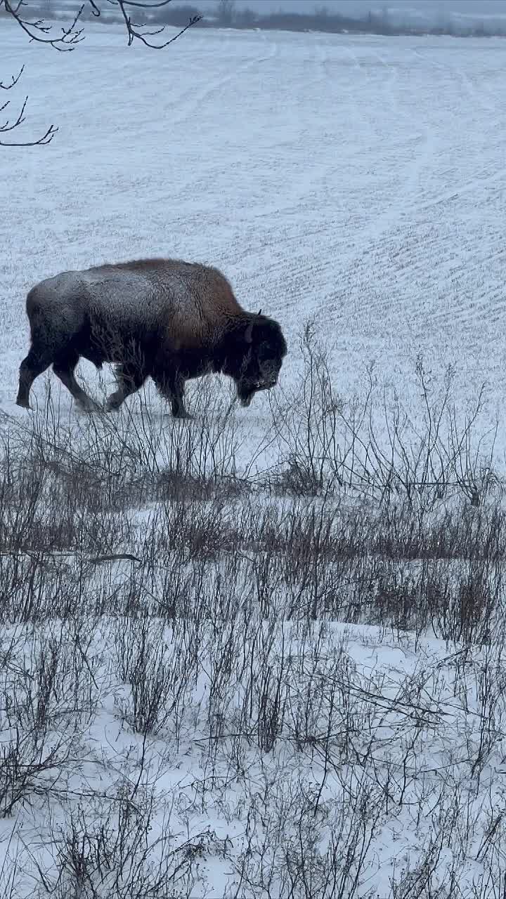 Как сообщают жители, небольшая группа бизонов пасется вдоль дороги.