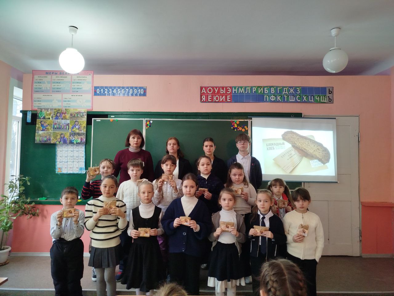 Активисты "Движения Первых", ученики 10 класса подготовили информацию для учеников 1- 4 классов, о пережитых трудностях в тяжелые дни блокады, мультфильм " Воробышек", нарезали ржаной хлеб кусочками весом 125 граммов.