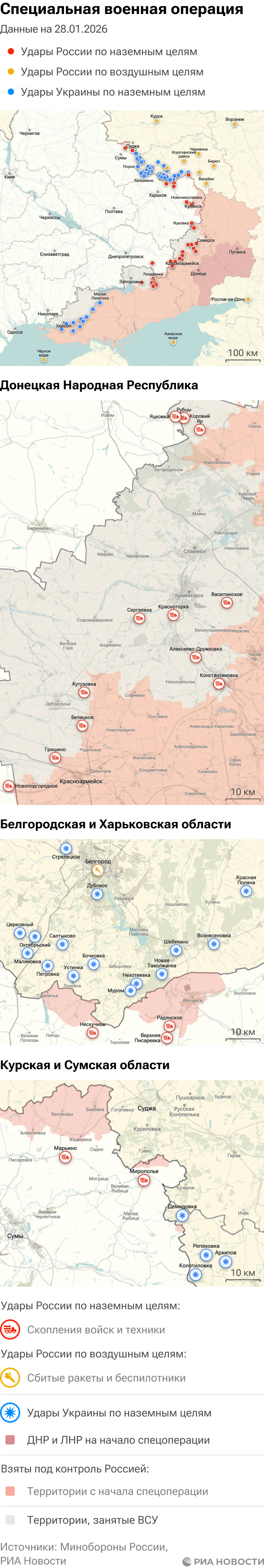 Российская армия с 24 февраля 2022 года проводит на Украине специальную военную операцию. Ее главной целью является помощь Донецкой и Луганской народным республикам, на территории которых с 2014 года не прекращались обстрелы. Перед российскими военными поставлена задача минимизировать потери личного состава и мирного населения при выполнении боевых заданий.Данные Минобороны и администраций новых регионов на 28 января 2026 года